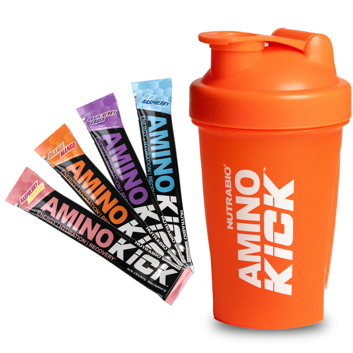 Energize your day with the Amino Kick Shaker Bundle, a perfect combination of on-the-go energy, hydration, and recovery. This bundle includes one of each delicious flavor: Orange Mango, Grape Berry Crush, Blue Raspberry, and Raspberry Lemonade. Each stick pack in the bundle contains 6g of amino acids, 0g sugar, and 100mg of natural caffeine, making them ideal for vegetarian and keto diets, and free from GMOs, gluten, or soy.