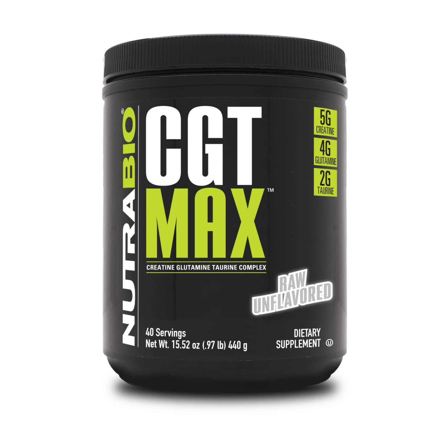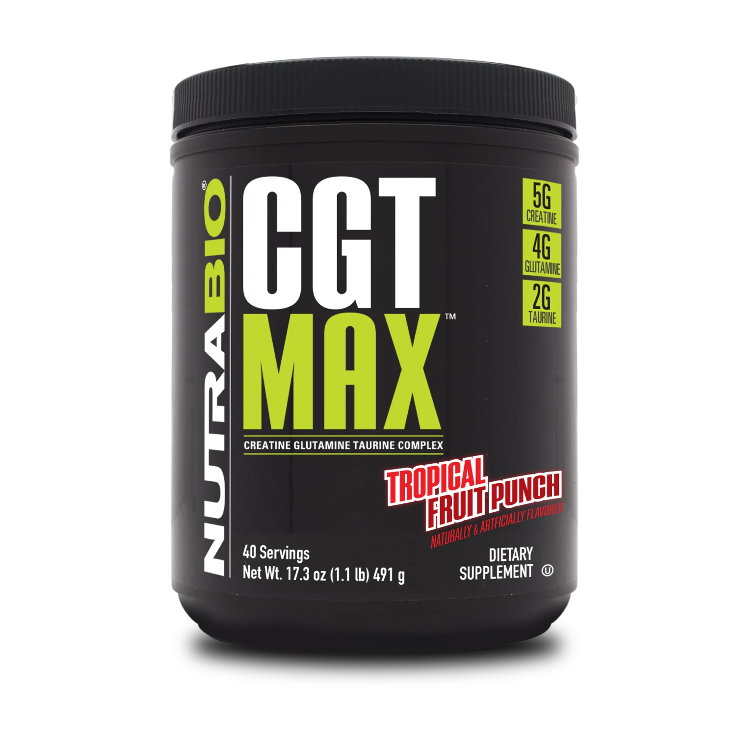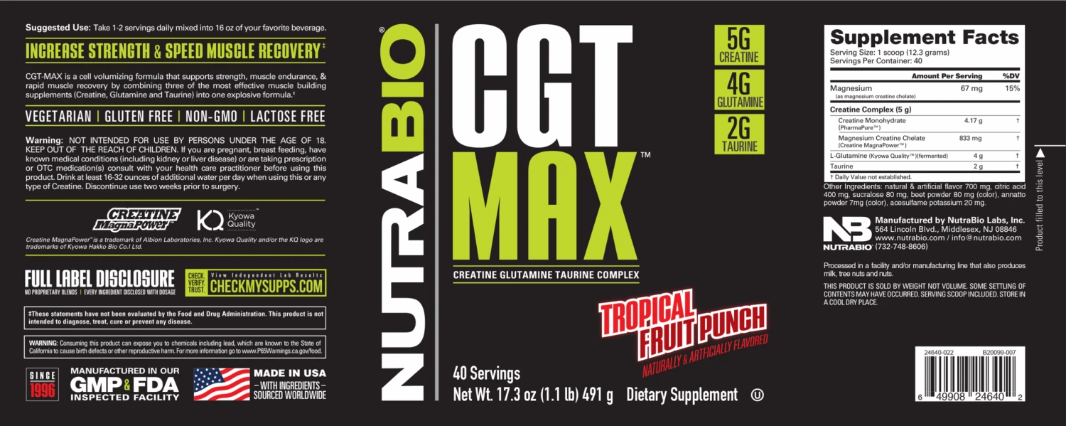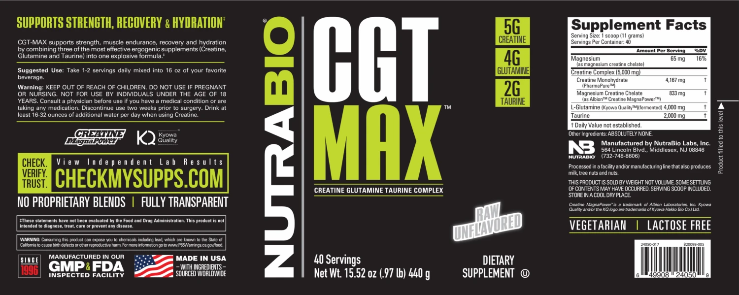 Each serving provides 5g of creatine derived from a combination of two trademarked sources in the form of Creatine Monohydrate (PharmaPure™) and Creatine Magnesium Chelate (Creatine MagnaPower™), 3.5g of the highest quality trademarked L-Glutamine , and 2g of taurine. CGT-MAX is a must for strength or endurance athletes as it guarantees maximum gains in muscle strength, growth, and endurance while substantially reducing muscle recovery time between workouts.