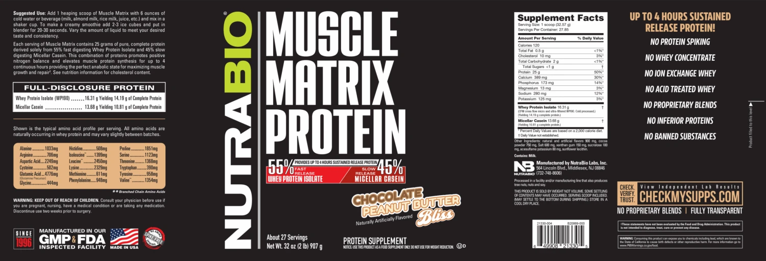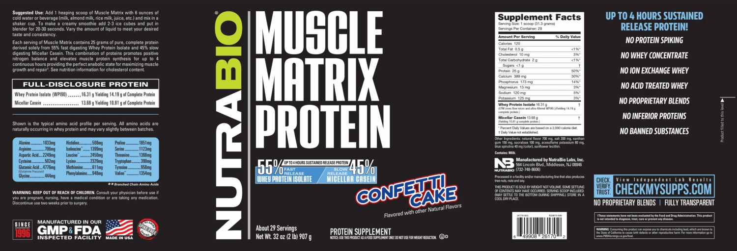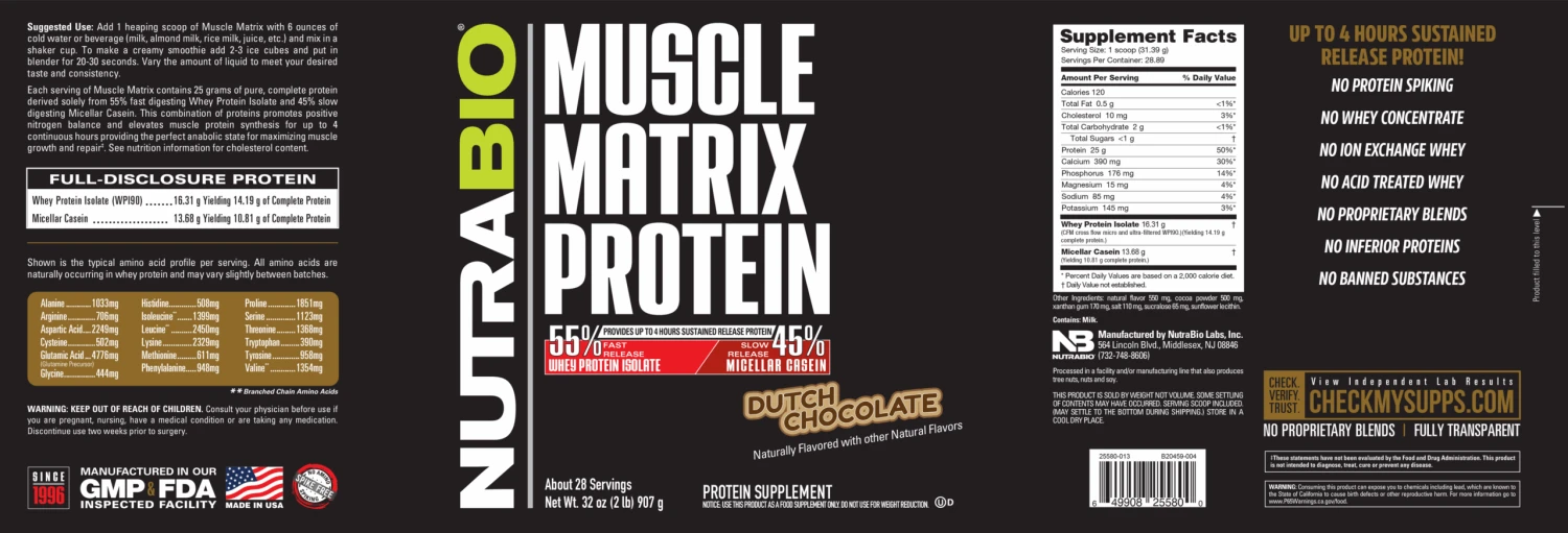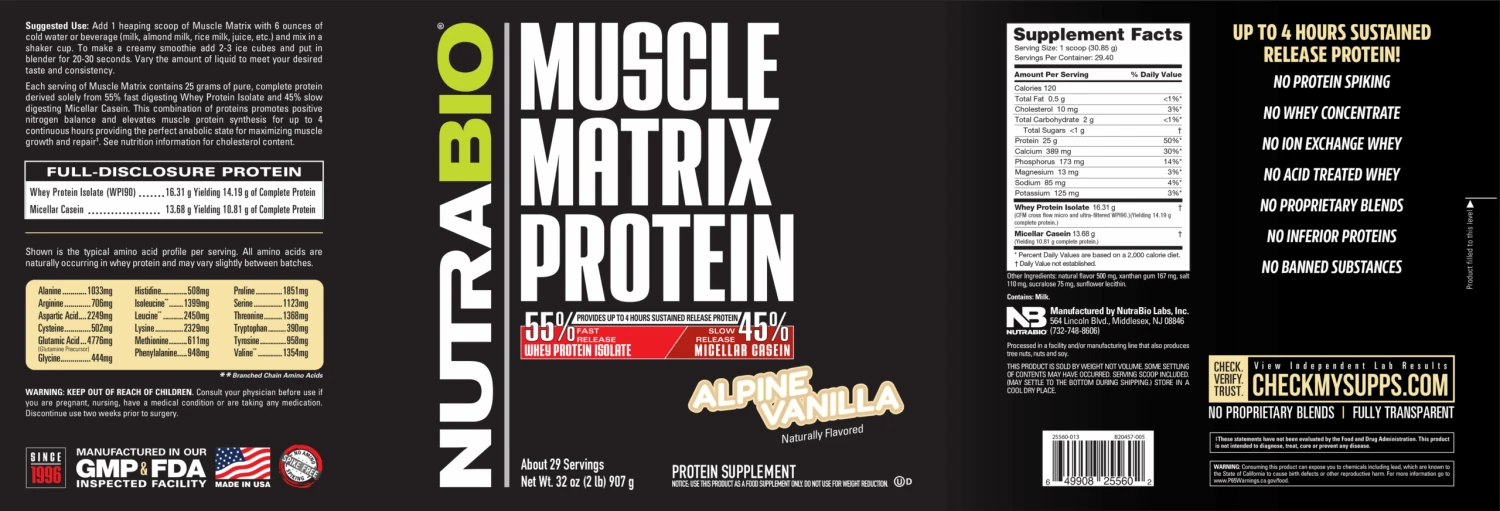 Muscle Matrix contains 25 grams of pure, complete protein derived from two different milk sources that digest and absorb at different rates to ignite muscle protein synthesis and keep amino acid levels elevated for several hours. The benefit of prolonged amino acid absorption is that it helps keep you in an anabolic state — maximizing muscle growth and repair while minimizing muscle breakdown.