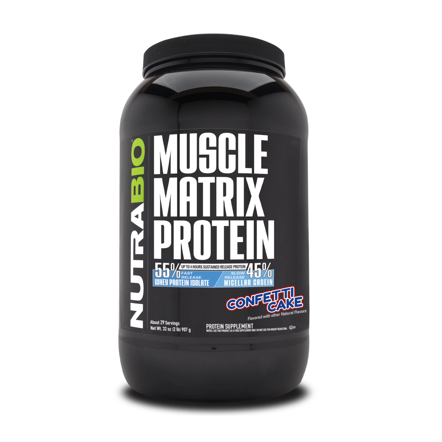 Together, the whey protein isolate and micellar casein in Muscle Matrix provide the ideal and perfect times to help support muscle recovery and growth.
