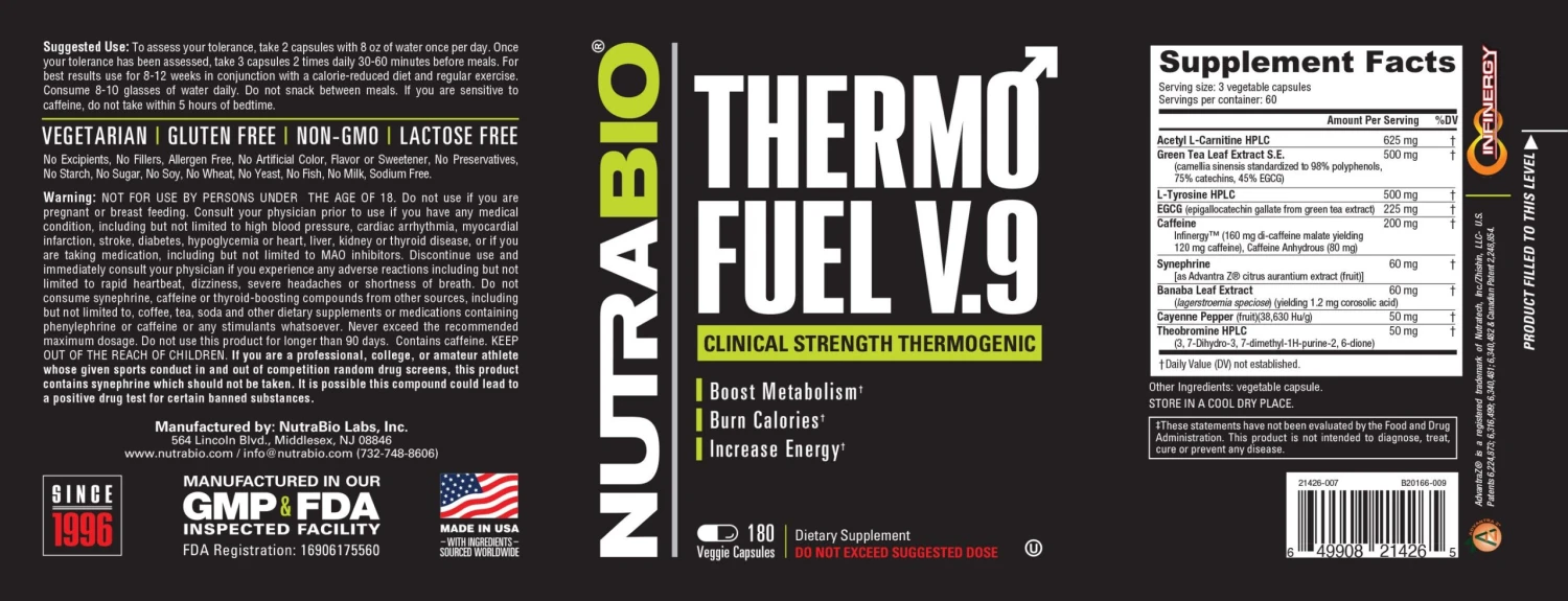 You’re sick of stubborn body fat that won’t disappear. Now, you have the spark that lights the fuse to watch that fat incinerate — uncovering all your hard work in the gym and kitchen. NutraBio ThermoFuel V9 isn’t your typical thermogenic, it’s the most potently formulated product utilizing clinical strength ingredients that help melt away fat cells. The combination of fat-metabolizing ingredients, along with elevated energy, appetite reduction, and mental focus put you in a position to see unrivaled results by following your strict training and nutrition program.
