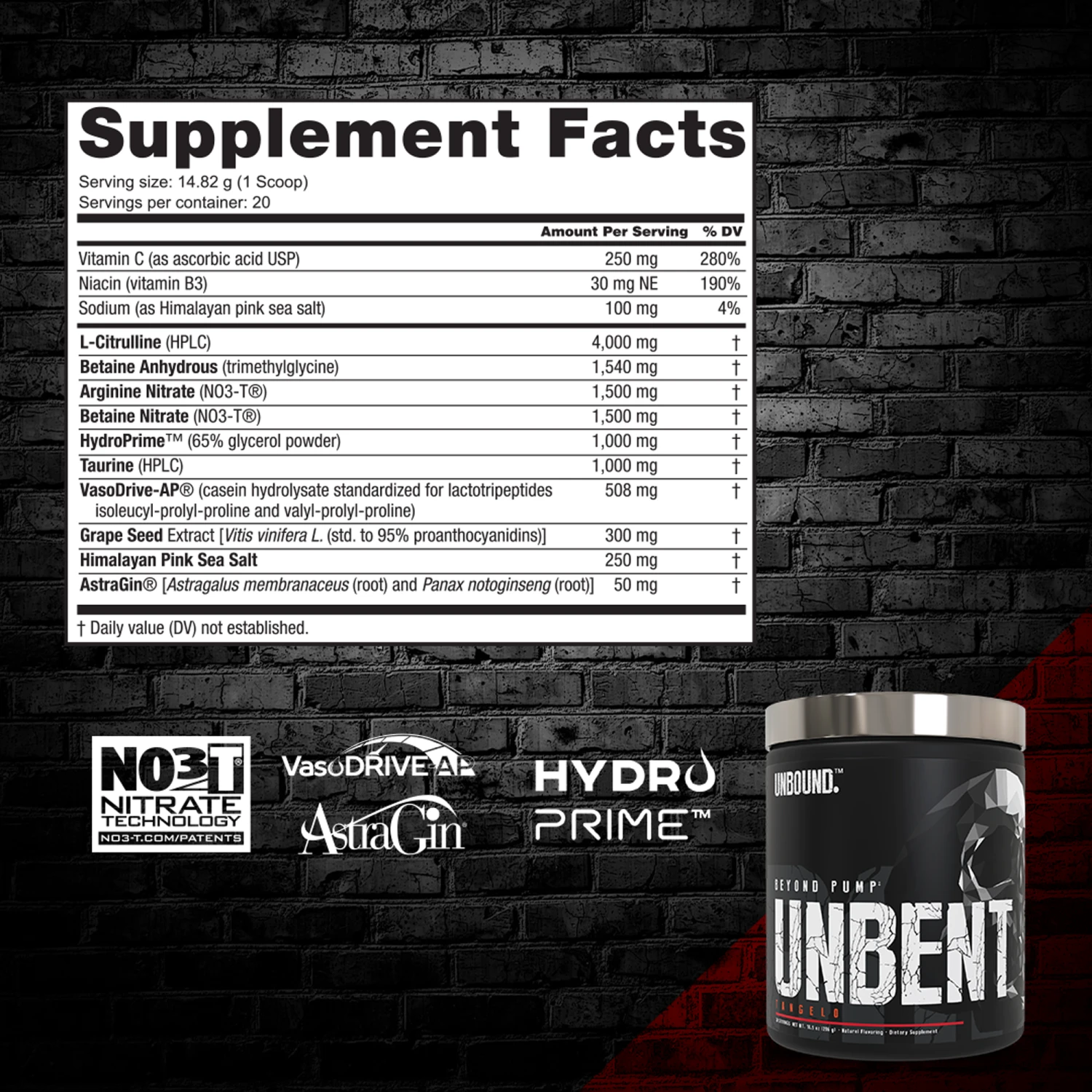 UNBENT isn’t merely a pump enhancer; it’s a vessel to monstrous vascularity and surreal muscle fullness. Yes, the cartoonish swell and the heads turning in awe are part of the package, but the essence of UNBENT dives deeper into the physiology of peak performance. With a formula rich in patented and trademarked ingredients, UNBENT is engineered to skyrocket nitric oxide levels and widen your blood vessels. This mechanism floods your muscles with nutrient-rich, oxygenated blood, amplifies your endurance, and flushes out fatigue-inducing byproducts like lactic acid. The result? A profound ability to push harder and longer, set after set, without hitting the brakes.